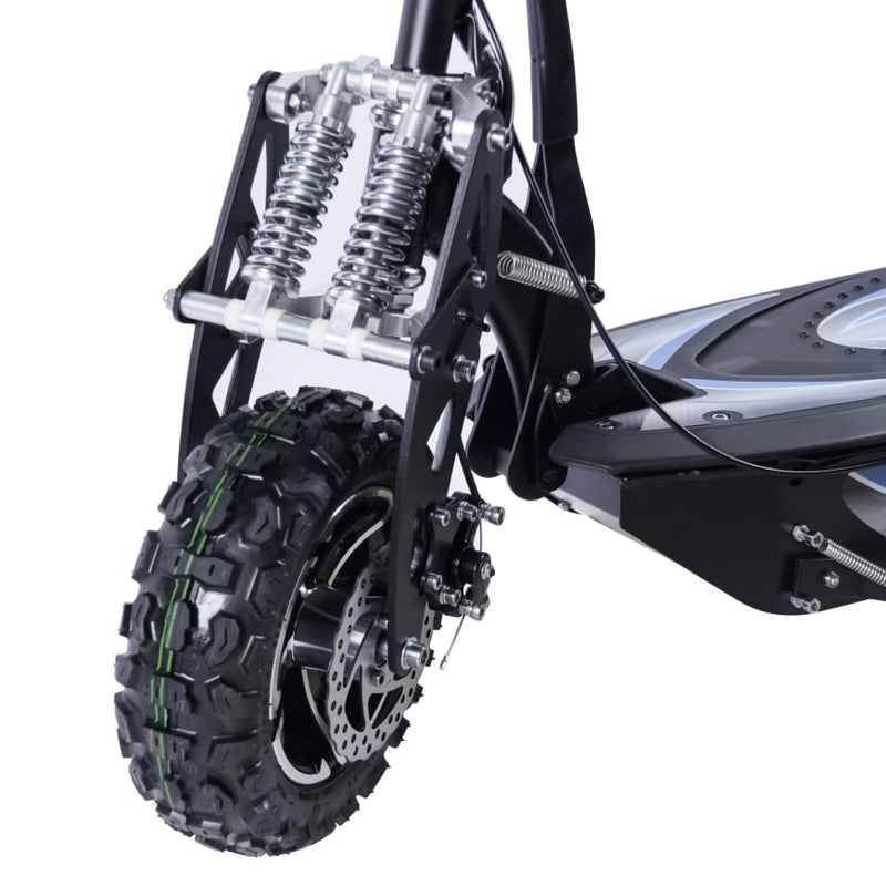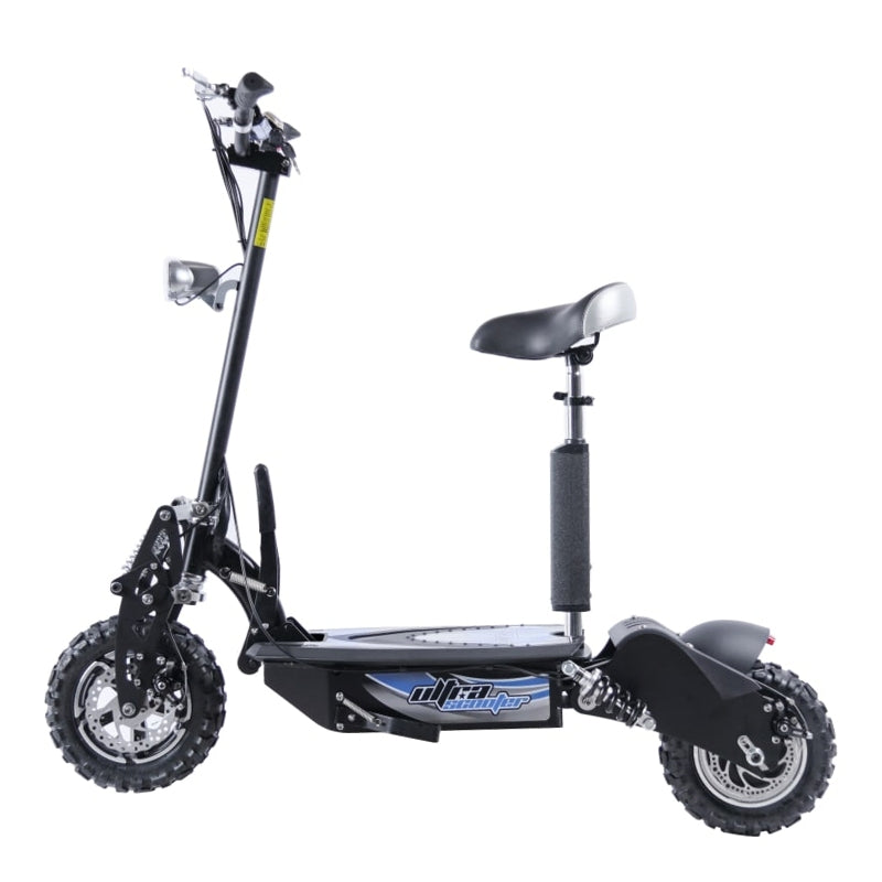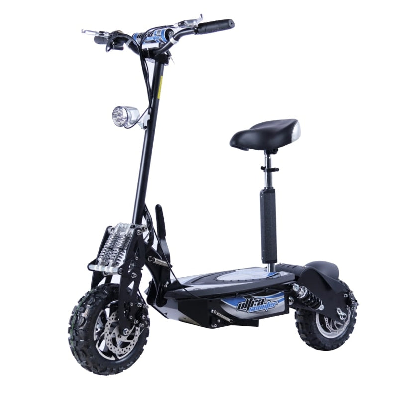 The scooter has large front and rear Bolds disc brakes, pneumatic tyres, and dual rear shock absorbers. The seat is removable/adjustable, and the scooter folds for easy transport and storage.